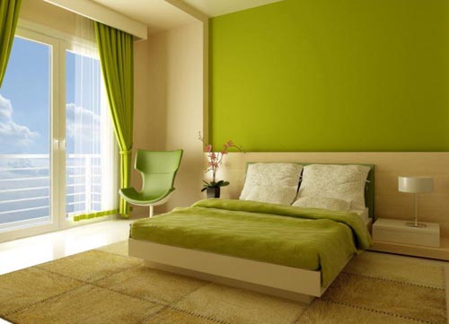 Mảng nhấn mầu xanh lá kết hợp với mầu nền xanh nhẹ tạo nên 1 không gian trong sáng, mát mẻ cho phòng ngủ
