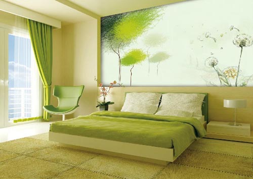 Nếu không thích mầu nhấn xanh lá đơn điệu, bạn cũng có thể thay bằng 1 bức tranh tường để tạo điểm nhấn cho căn phòng